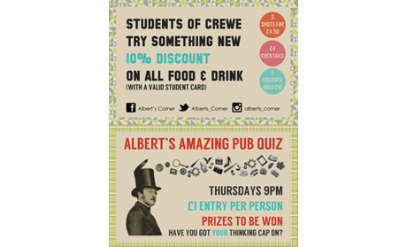 Menu and Print Designer at Albert's Corner Pub & Kitchen in Crewe 2014.